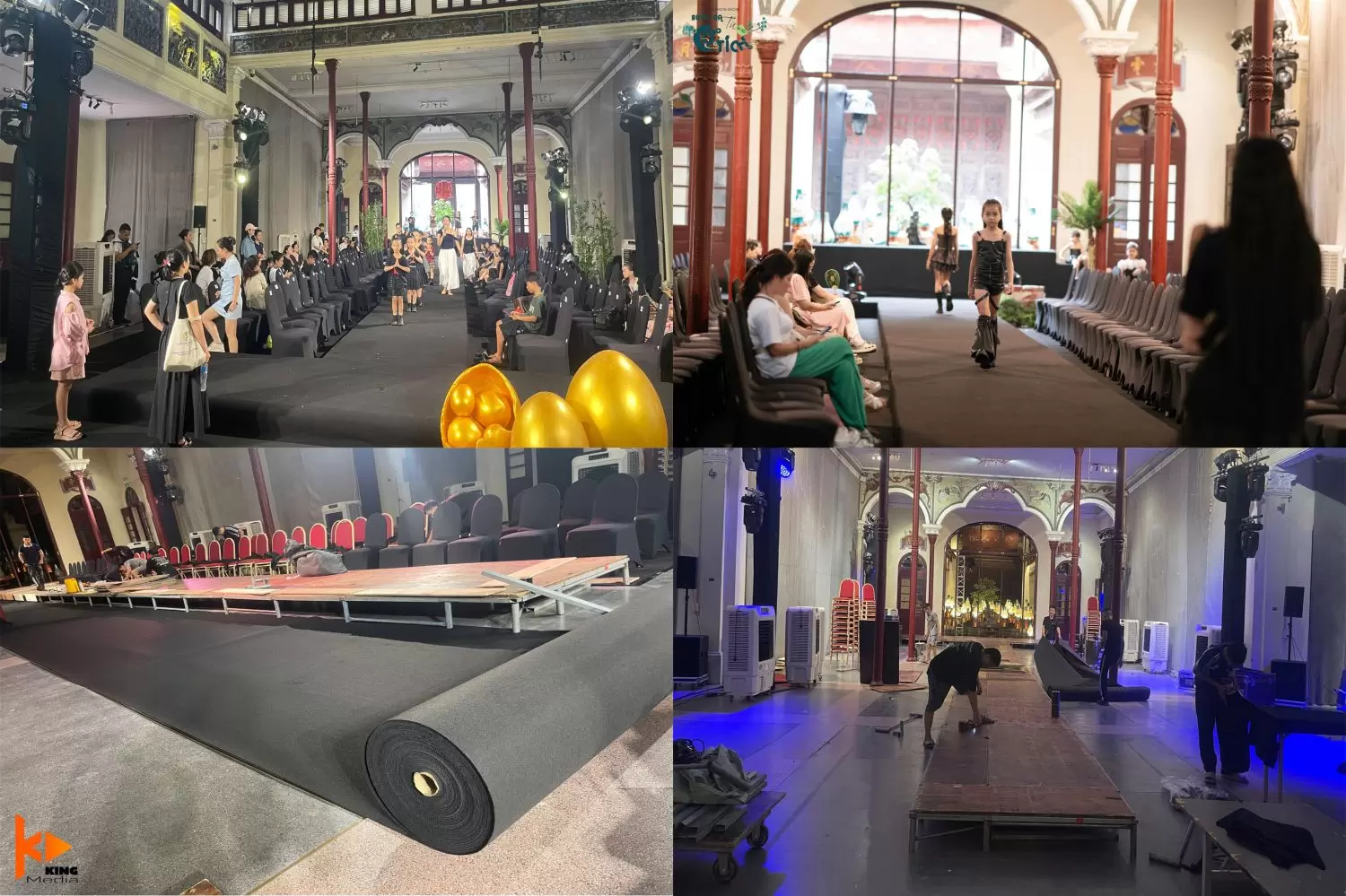 Không gian sân khấu được thiết kế sao cho vừa đáp ứng yêu cầu trình diễn nghệ thuật, vừa đảm bảo an toàn – thẩm mỹ – tầm nhìn khán giả. Catwalk đủ dài để người mẫu thể hiện, ánh sáng đủ chiều để tạo chiều sâu thị giác.